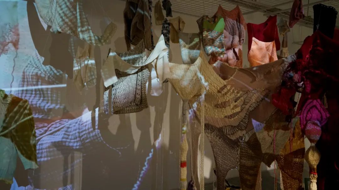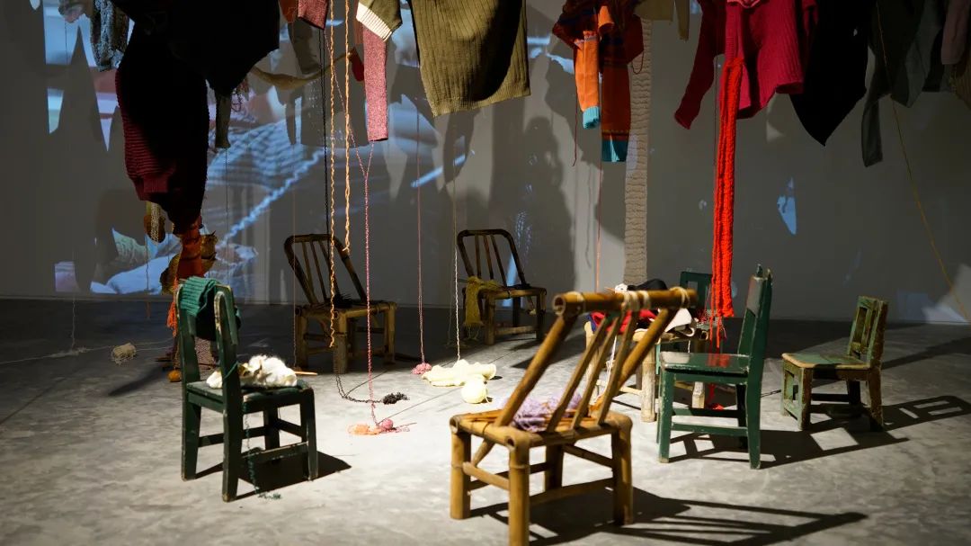 作品介绍:我收集了许多自己与朋友的旧毛衣,进行拆解与重组。悬挂着的旧织物代表着时间沙漏,而拆下的一根根弯曲的毛线又如流淌的时间。我希望能够通过大家已经习以为常的编织活动本身,将编织作为一种语言,解读旧时光,并连结你我的时间与记忆。作品现场,观者可进入场地进行记忆交流,并随机从悬挂的旧织物中扯下毛线来编织与拼接。参与者在互动过程中不仅使用了语言交流,在手中也使用棒针、钩针与毛线的“编织语言”书写,这些“话语” 最终聚集在一起,形成无声“交流”的画面,也就是正中悬挂的随大家参与而不断变化的织物。