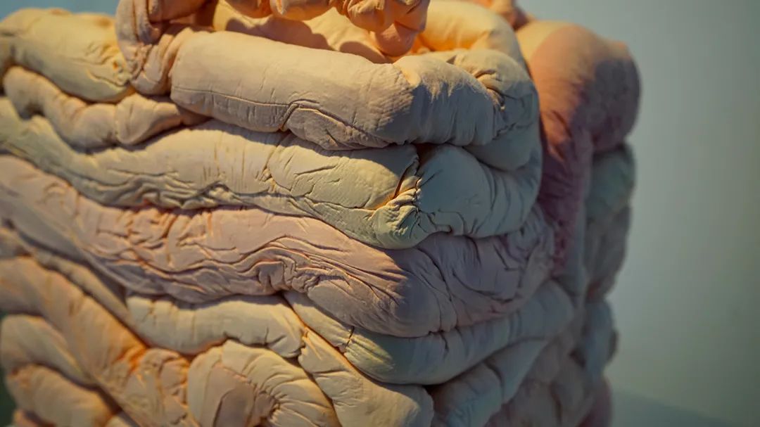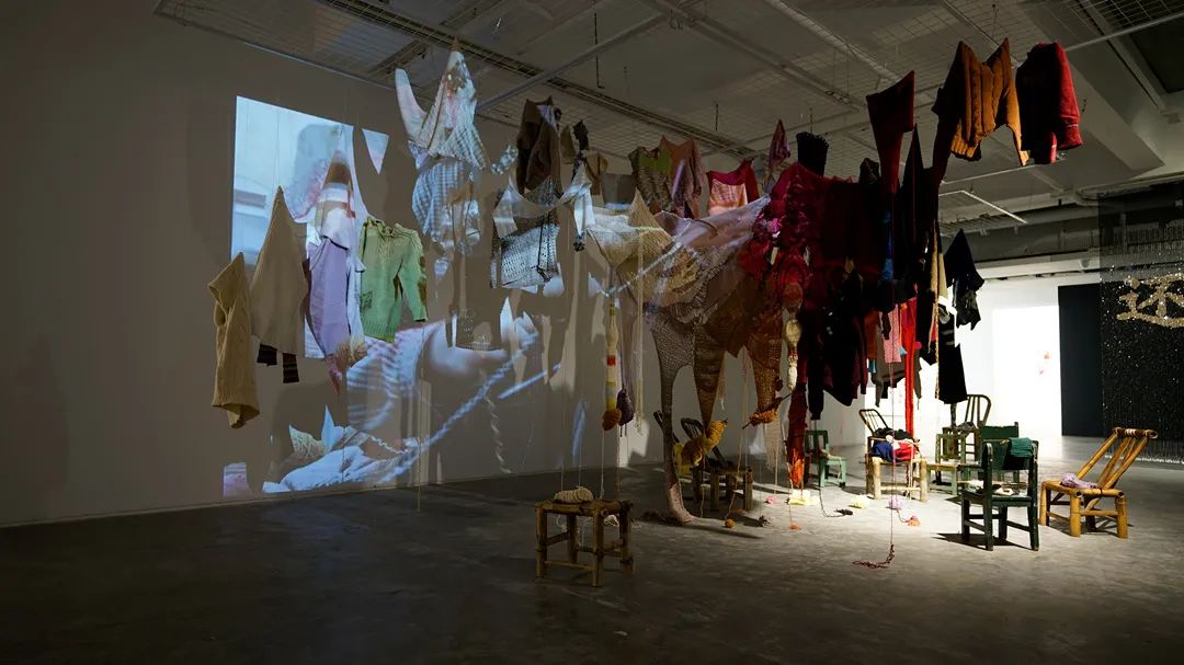答:有,在我看来编织可以理解为一种交织、连接、延续的状态,而我的作品正是呈现了人与"衣裳"的直接相连和人与社会环境复杂交织并会一直延续的状态。不同媒介的替换和结合非常具有魅力,这也可以理解为编织,编织可以是无秩序的。